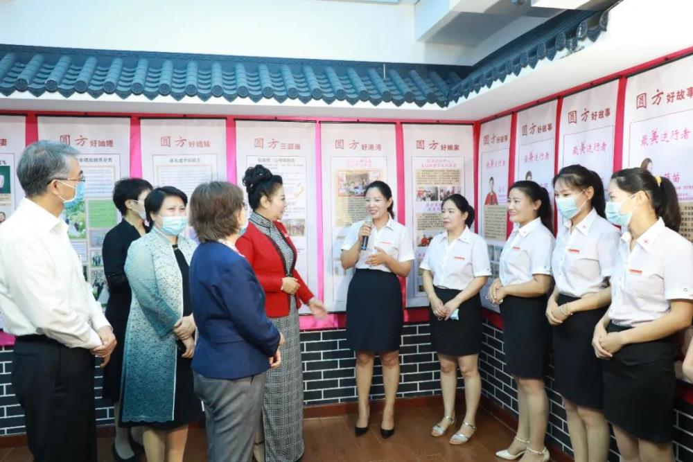 薛書(shū)記向各位領(lǐng)導介紹了圓方婦聯(lián)“1+5+1”創(chuàng )新工作法,即政治引領(lǐng)+巾幗雙創(chuàng )、巾幗脫貧、巾幗維權、巾幗關(guān)愛(ài)、巾幗成才+尋找最美家庭。當大家走近“最美家庭”展示墻時(shí),被一旁著(zhù)統一工裝、整齊站立且長(cháng)相秀美的“六朵金花”深深地吸引了。她們是圓方集團最美家庭之一的“郭氏五姐妹+弟媳”,“六朵金花”都在圓方工作,愛(ài)人都是圓方物業(yè)公司的中高層管理人員。20多年前,大姐郭曉峰因家境貧寒,輟學(xué)來(lái)到圓方工作。后來(lái),她的四個(gè)妹妹和弟弟也都相繼來(lái)到了圓方,并且都走上了管理崗位。在她們的帶動(dòng)下,目前郭氏家族共有500多人在圓方工作,不但為親戚解決了就業(yè)問(wèn)題,還幫助他們脫貧致富。